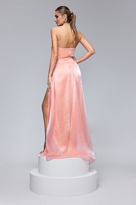 Abito lungo elegante senza spalline, busto accessoriato con paillettes e piume, gonna ampia con spacco.