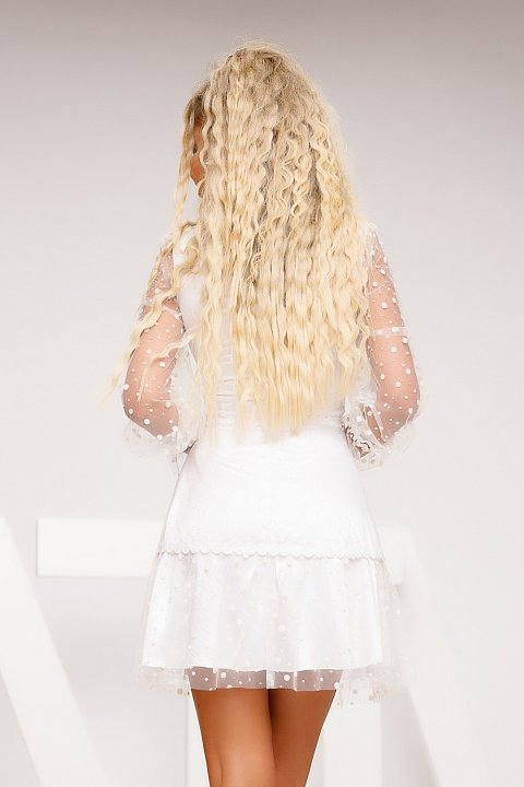 Abito a bambolina bianco in tulle operato. Sagomato il corpino a maniche a sbuffo e gonna a ruota senza volume, insieme elegantemente definiti da zone foderate ed altre trasparenti.