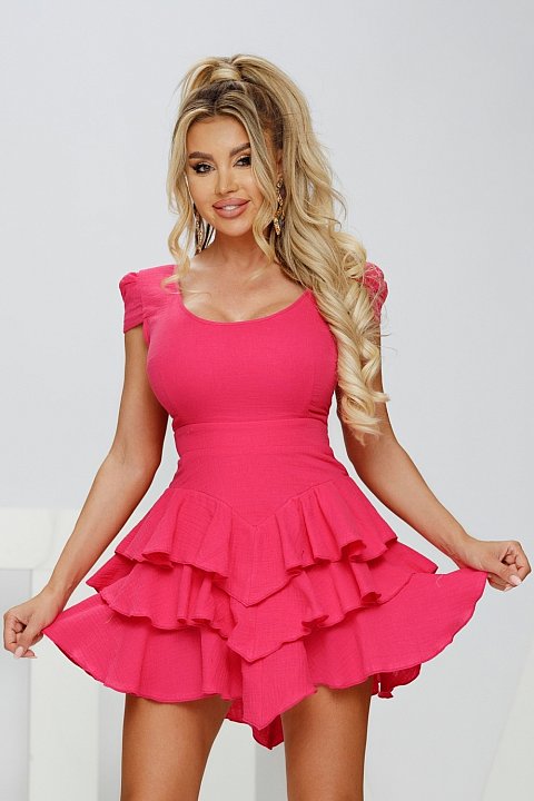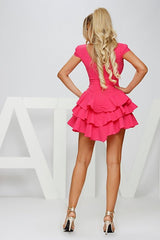 Abito corto fucsia con balze, modello casual. L'abito ha una scollatura, maniche a conchiglia e una schiena ampia.