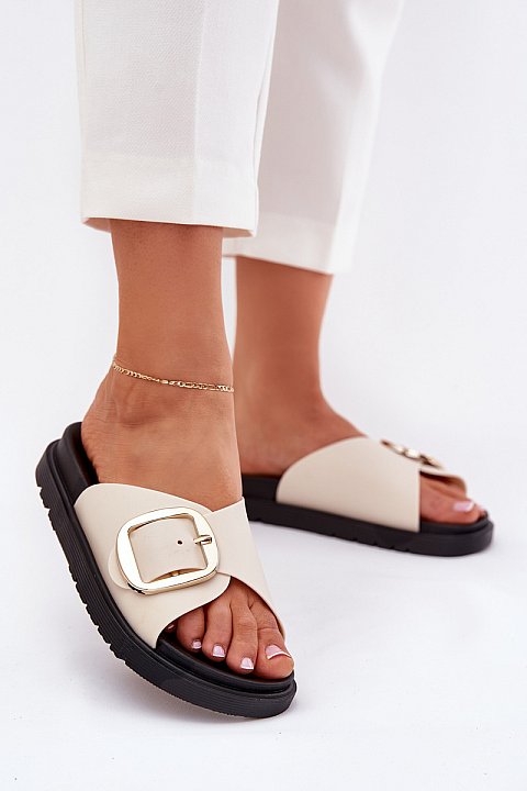 Perfette per un'estate all'insegna della praticità senza rinunciare al glamour, queste ciabatte beige su piattaforma nera conquistano con il loro design minimal impreziosito da una maxi fibbia dorata. La fascia larga garantisce stabilità, mentre la suola leggermente rialzata offre comfort per tutto il giorno. Ideali per completare look casual-chic, outfit da viaggio o passeggiate in città. Versatili, moderne e facili da abbinare.