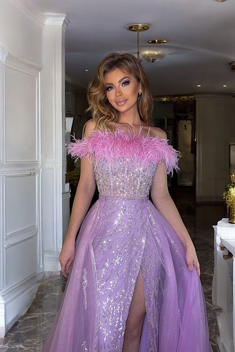 Questo incantevole abito da sera lilla cattura l’attenzione con il suo design da sogno. Realizzato in tulle leggero, è arricchito da scintillanti paillettes e dettagli in piume che adornano lo scollo a barca. Lo spacco frontale e il corpetto semitrasparente donano un tocco di glamour e sensualità, rendendolo perfetto per eventi esclusivi e serate indimenticabili. Abbinalo a sandali gioiello per un look impeccabile.