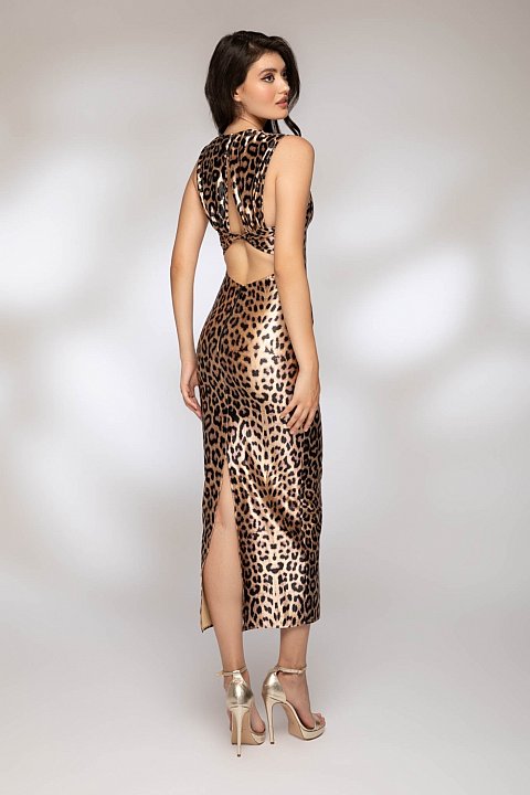 Questo abito lungo con stampa animalier esalta la tua silhouette con un effetto aderente e raffinato. La stampa leopardata dorata aggiunge un tocco lussuoso, mentre il dettaglio di apertura sulla schiena e lo spacco laterale completano il look con sensualità. Perfetto per una serata glamour.
