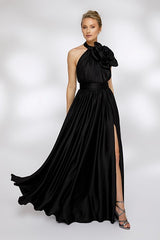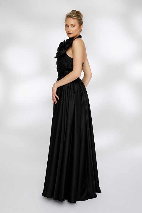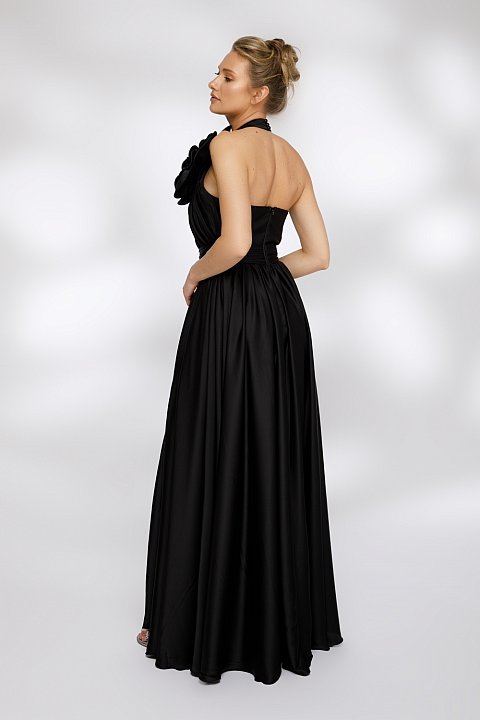 Abito lungo elegante con spacco, scollo all'americana e spilla a fiore come accessorio della modella, plissé sul bustier.