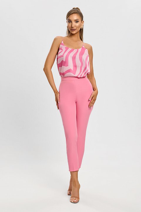 Aggiungi un tocco di femminilità e stile al tuo guardaroba con questa blusa rosa dal design raffinato. Realizzata in tessuto leggero e fluido, presenta una stampa astratta sui toni del rosa e del bianco, spalline sottili e una vestibilità morbida che valorizza la silhouette. Ideale per abbinamenti chic con pantaloni a vita alta o gonne eleganti. Perfetta per ogni occasione, dal giorno alla sera.