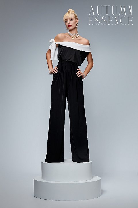 Blusa bicolore a spalle scoperte con scollo a revers annodabile sul braccio.