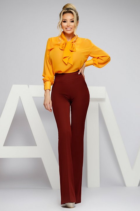 Blusa in voilè doppio giallo senape. Modello casacca dal taglio dritto, maniche lunghe chiuse da elegante polsino, e collo allacciato con sciarpetta.
