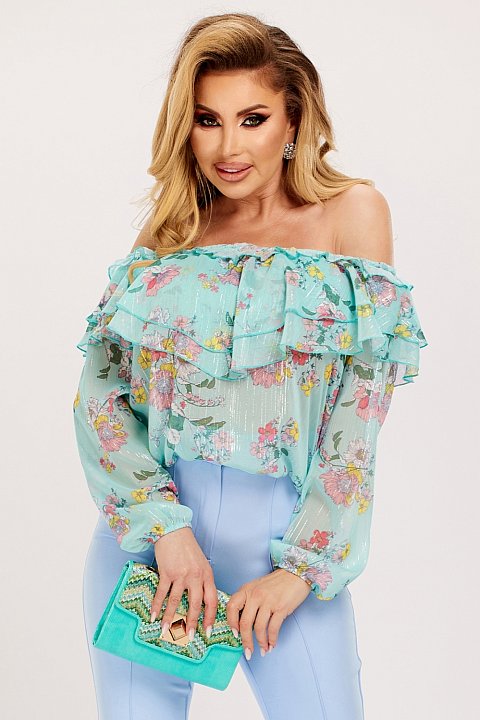 Blusa con scollo a barca e volant esprime uno stile romantico e delicato. Il tessuto leggero, caratterizzato da una stampa floreale vivace, conferisce un tocco femminile e primaverile al look. Il design con spalle scoperte e maniche lunghe vaporose aggiunge una sensazione di eleganza casual, perfetta per occasioni rilassate o anche per un'uscita serale informale. L'abbinamento con pantaloni a vita alta in tonalità pastello completa il look, mantenendo l'armonia tra i colori freschi e luminosi.