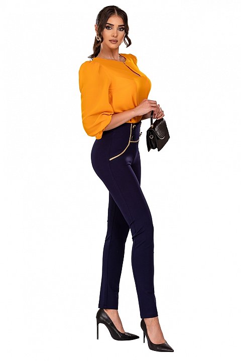 Blusa con apertura a goccia sullo scollo e maniche a tre quarti, spalline a sbuffo.
