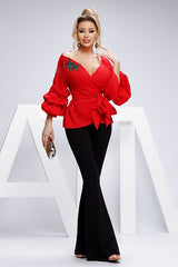 Elegante camicia rossa con maniche a sbuffo e profondo scollo a V
