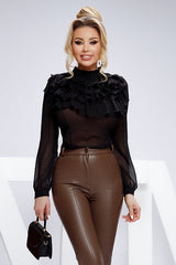 La camicia nera è una camicia sexy con volant sul busto. La maglia è semitrasparente, ideale per una donna indipendente e sensuale. La maglia si chiude con bottoni sul retro