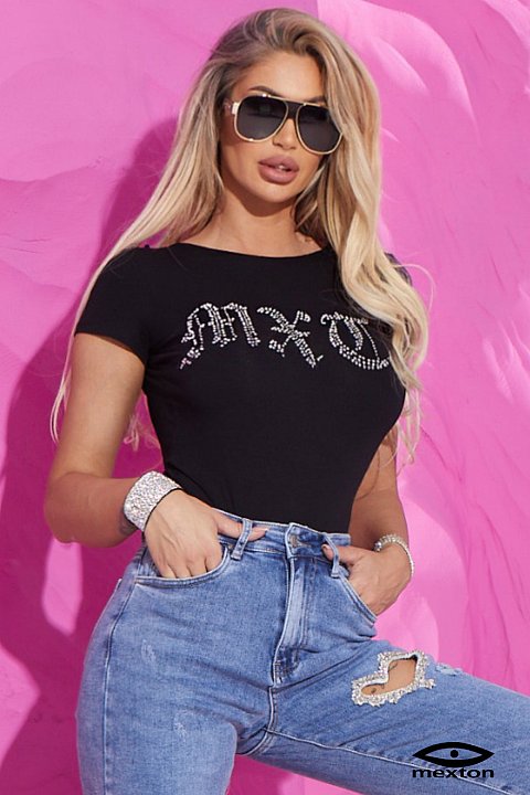 Body a maniche corte con scritta in strass, laccio dietro al collo e schiena scoperta.