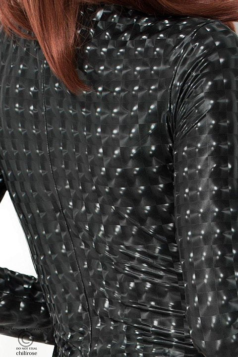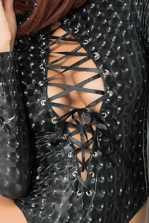 Originale body sgambato nero, a maniche lunghe, dal tessuto elasticizzato con stampa effetto 3D. Chiusura mediante zip nascosta sulla schiena e tripla regolazione al cavallo. Apertura anteriore regolabile tramite stringatura.
