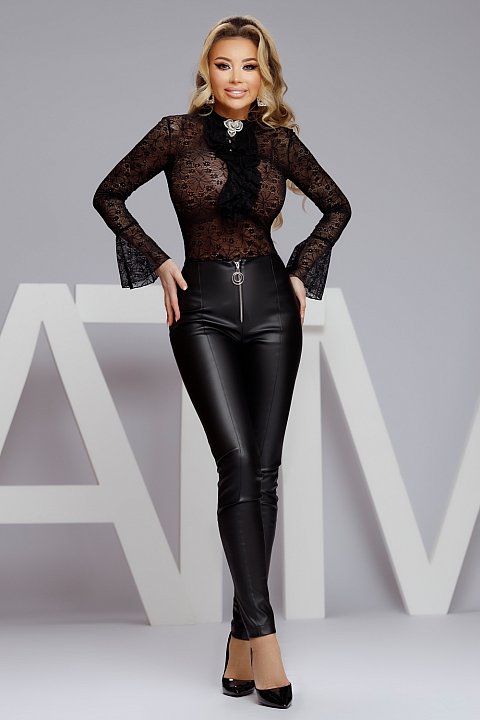 Body in pizzo nero con balze, trasparente. ? accessoriato con una spilla. Maniche lunghe e svasate.
