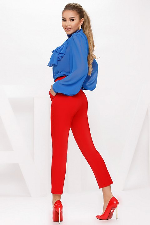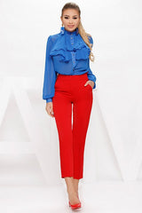 Camicia elegante in chiffon blu con dettagli a volant e bottoni decorativi.