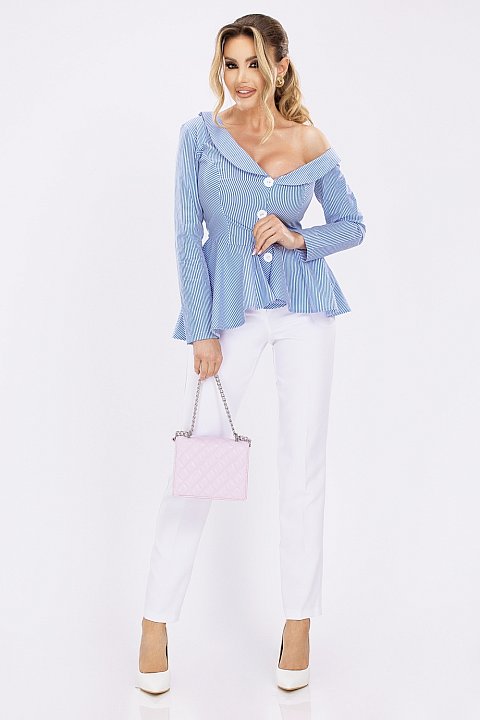 Camicia a righe molto versatile, a spalle scoperte e con grandi bottoni bianchi. L'orlo è asimmetrico.