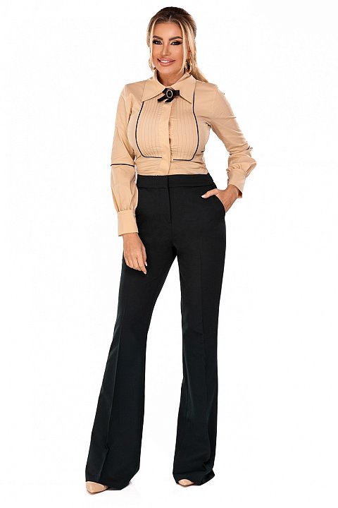 Camicia elegante con spilla a fiocco e rifiniture nere a contrasto.