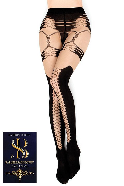 Collant in Lycra, beige-nero, con design originale e disegno con finto reggicalze. Tassello in cotone. 20/60 denari.