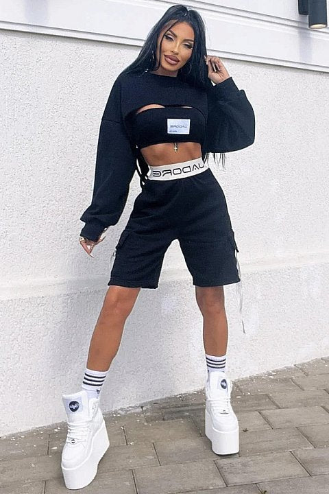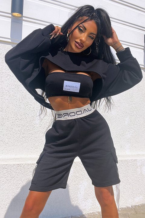Completo sportivo 3 pezzi composto da top a fascia, felpa bolero ampia e pantaloncini a vita alta con tasche.