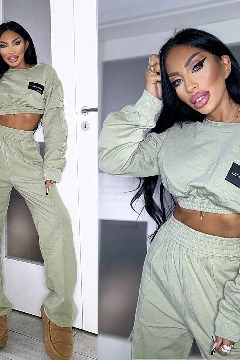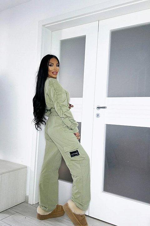 Completo sportivo 2 pezzi composto da felpa cropped e pantaloni a vita alta arricciata con tasche e patte.