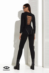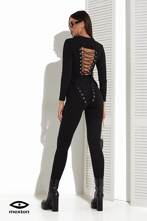 Completo casual monocolore composto da maglia a lunghe maniche e leggins slim fit. Dettaglio lacci intrecciati sul retro del completo.