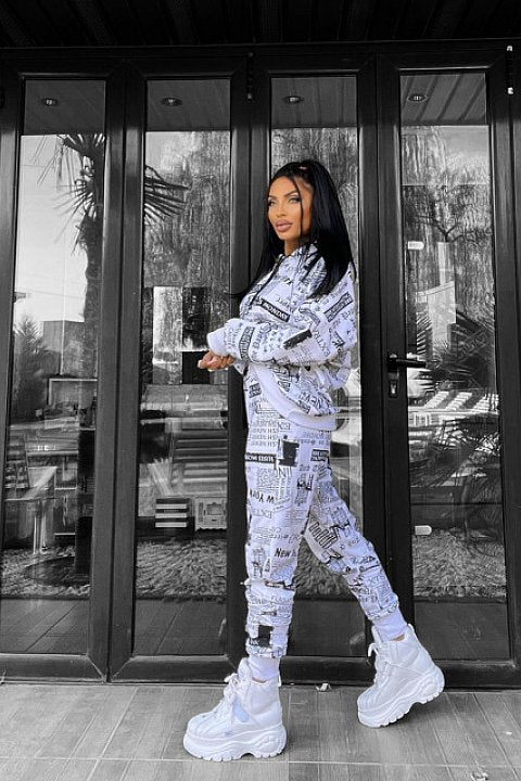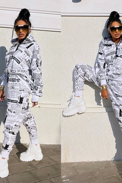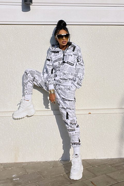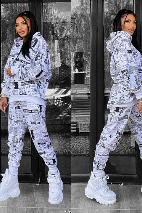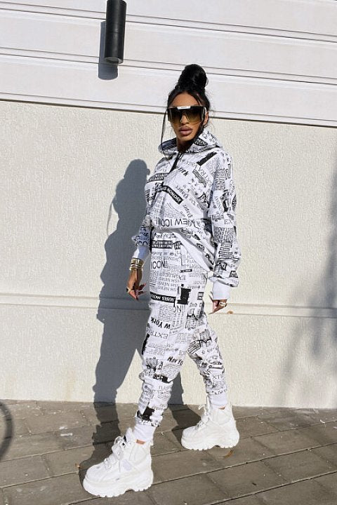 Completo sportivo 2 pezzi con fantasia giornale. Felpa oversize con cappuccio e pantaloni regular fit con tasche e lacci.