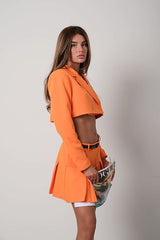 Scegli un look deciso e alla moda con questo completo blazer cropped e minigonna a pieghe in arancione acceso. Il blazer corto a doppiopetto esalta la silhouette con il suo taglio strutturato, mentre la minigonna a pieghe con dettaglio di cintura aggiunge un tocco dinamico e femminile. Il tessuto di alta qualità assicura una vestibilità confortevole e raffinata, perfetta per creare outfit eleganti e moderni.