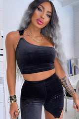 Set di 2 pezzi, realizzato in velluto nero, composto da un top con un unico cinturino. E pantaloni lunghi con un taglio su una gamba. Modello molto sexy.