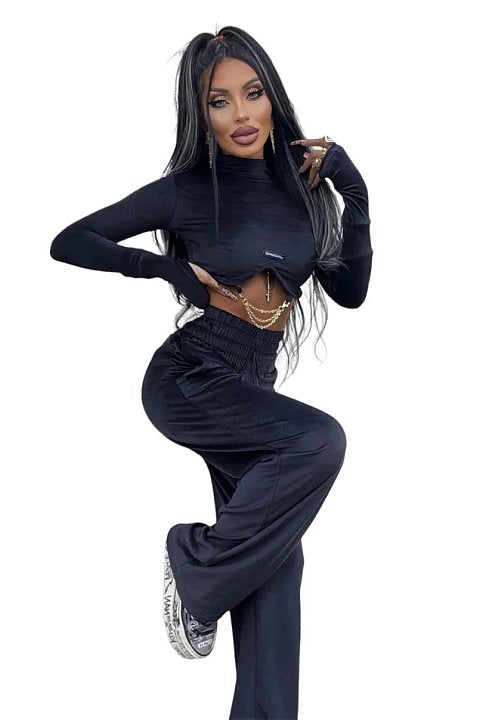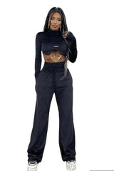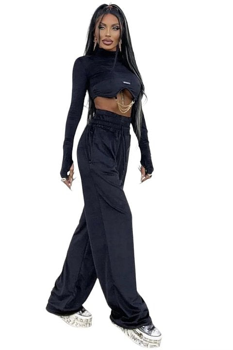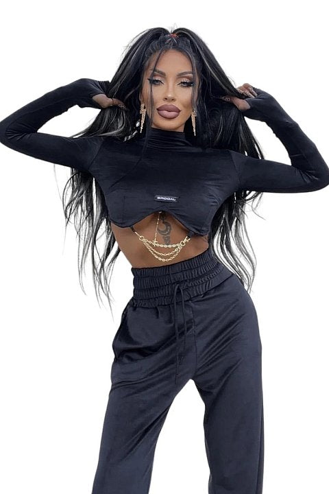 Completo sportivo 2 pezzi composto da maglia cropped con catena decorativa e fori per il pollice, e pantaloni larghi a vita alta.