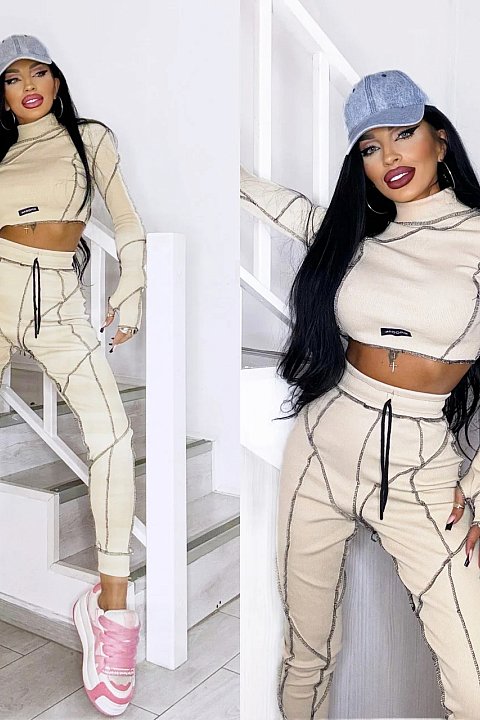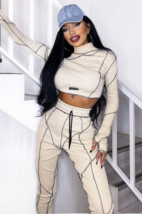 Completo sportivo 2 pezzi composto da maglia cropped dolcevita a maniche lunghe e pantaloni slim fit a vita alta, con rifiniture a contrasto di colore tono su tono.