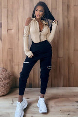 Completo sportivo 2 pezzi composto da body a maniche lunghe a collo alto con zip e spalle scoperte, e pantaloni a vita alta con cerniere apribili.