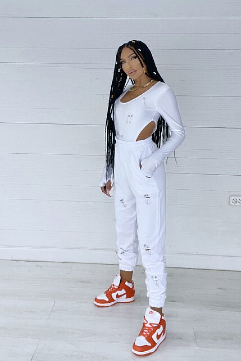Set casual composto da body e pantaloni sportivi. Modello bianco, con inserti tipo graffette argento.