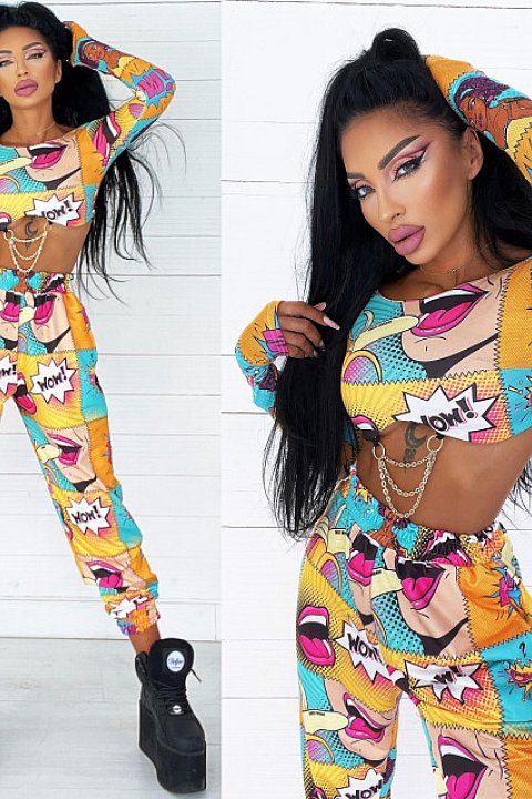 Completo sportivo 2 pezzi con stampa fumetti, composto da maglia girocollo slim con catena pendente, stile under cleavage e pantaloni con fascia elastica arricciata.