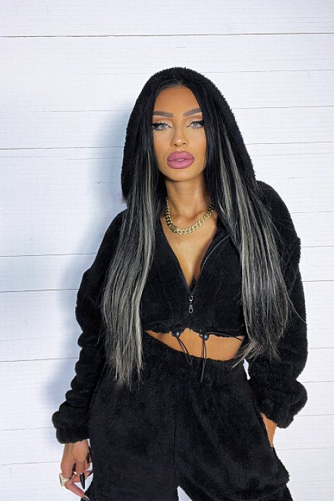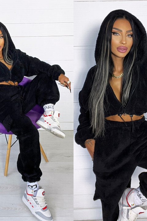 Completo sportivo coordinato 2 pezzi monocolore. Felpa oversize stile bolero con cappuccio, zip a contrasto e ferma coulisse. Pantaloni regular con elastico alle caviglie. La vestibilità nel complesso è casual.