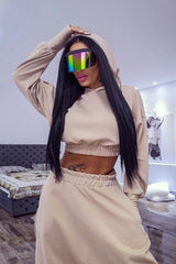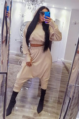 Completo sportivo color crema con pantalone alla turca. Maglia cropped modello felpa con cappuccio e sottotuta, coordinato, con gamba stretta sul fondo e cavallo profondo e abbondante.