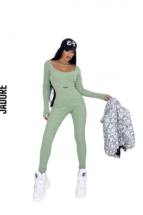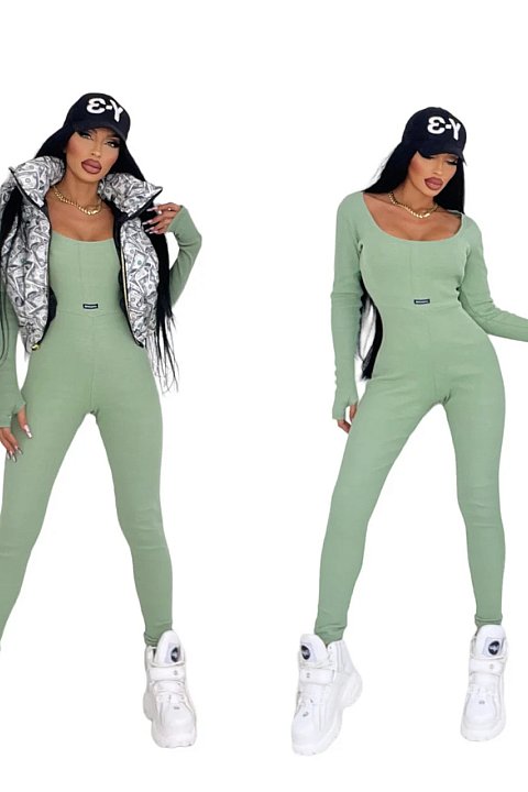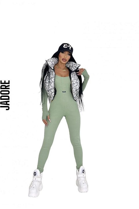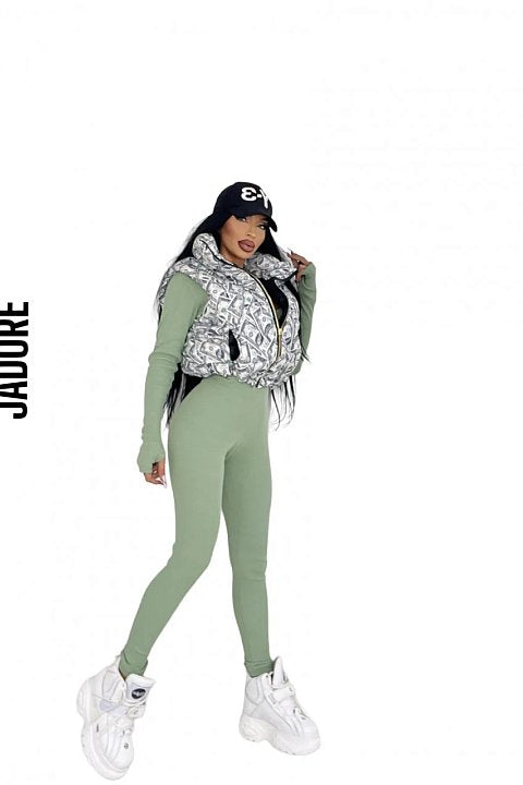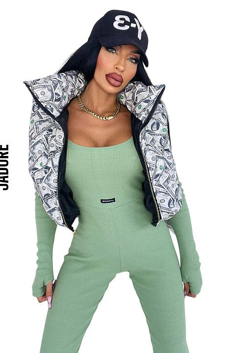 Completo sportivo 2 pezzi composto da jumpsuit monocolore aderente a costine, maniche con fori per il pollice e piumino smanicato in fantasia dollari con collo alto, tasche, cerniera e orlo arricciato sul fondo.