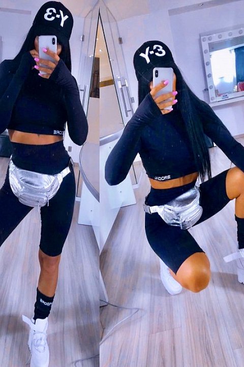 Completo fitness in lycra di colore nero. Pantalone pinocchietto a vita alta con maglia accollata a manica lunga e scaldamuscoli, coordinati.