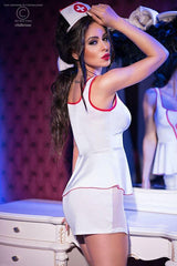 Completo infermiera realizzato in morbido tessuto elastico bianco con inserti a rete sul decolletè ed ai lati della minigonna. La forma a clessidra del top mette in evidenza il girovita rimanendo morbido ed ondulato nella parte inferiore; bordi e rifiniture rossi. Comprende: top, minigonna, perizoma e cuffia per i capelli.