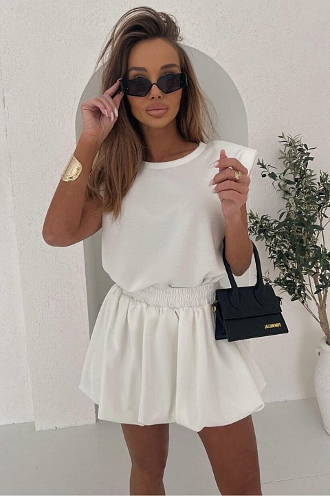 Il completo bianco è l’emblema della freschezza e dello stile contemporaneo. Il top con maniche decorative e taglio dritto valorizza la parte superiore, mentre la minigonna a palloncino con elastico in vita dona volume e femminilità. Realizzato in tessuto leggero, è perfetto per giornate calde, eventi all’aperto o shooting estivi. Da abbinare a sandali flat o tacchi bold per un look da influencer!