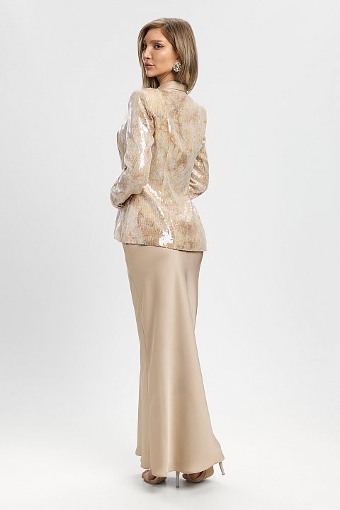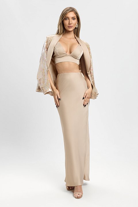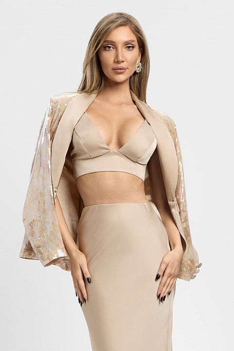 Dall’allure raffinata e moderna, questo completo color champagne è composto da un top a triangolo con taglio strutturato, una gonna lunga fluida e un blazer con paillettes iridescenti per un tocco sparkling. Ideale per party esclusivi, cerimonie serali o eventi di classe, questo look minimal ma di forte impatto è pensato per chi ama farsi notare con eleganza.