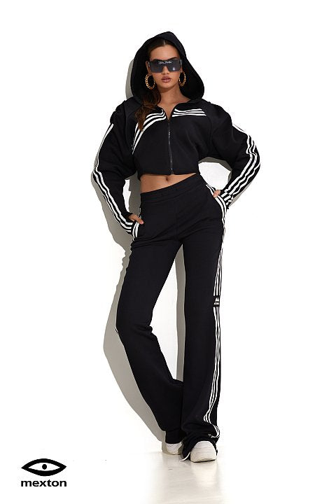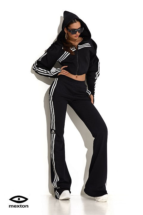 Completo sportivo bicolore 2 pezzi. Felpa con cappuccio stile bolero con zip e pantaloni a vita alta, svasati ed extra lunghi con tasche.