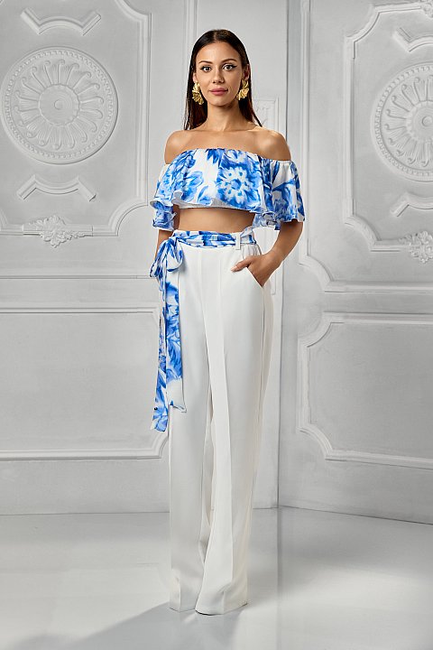 Il Co-Ord Set è la scelta ideale per chi cerca un look fresco e sofisticato. Composto da un top off-shoulder con volant e stampa floreale blu, abbinato a pantaloni bianchi a vita alta con cintura coordinata, questo completo è perfetto per giornate estive e eventi eleganti. Il design leggero e arioso del top esalta le spalle, mentre i pantaloni donano slancio e raffinatezza alla silhouette. Un outfit che unisce comfort e stile, perfetto per aperitivi, feste in giardino o passeggiate al mare.