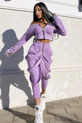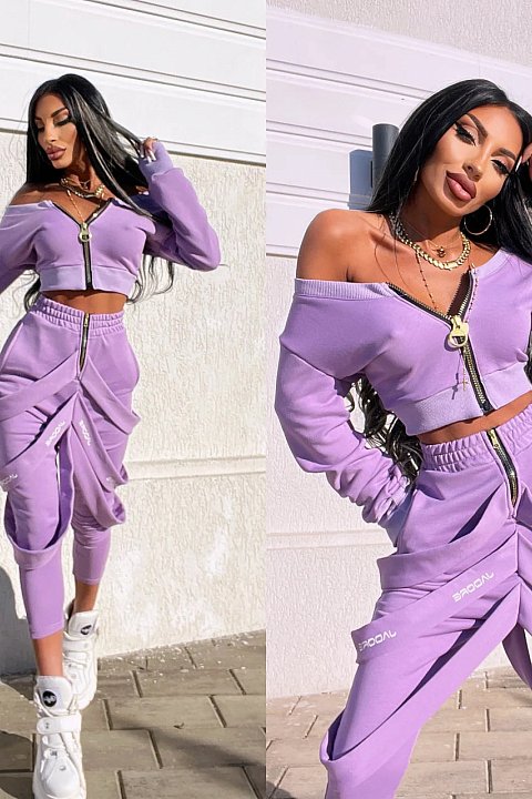 Completo sportivo 2 pezzi composto da felpa corta a spalle scoperte e pantaloni a vita alta con dettaglio catene elastiche all over.