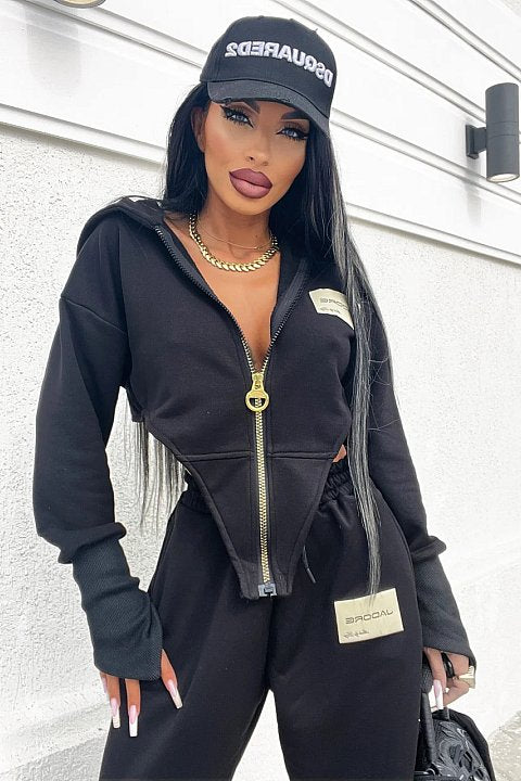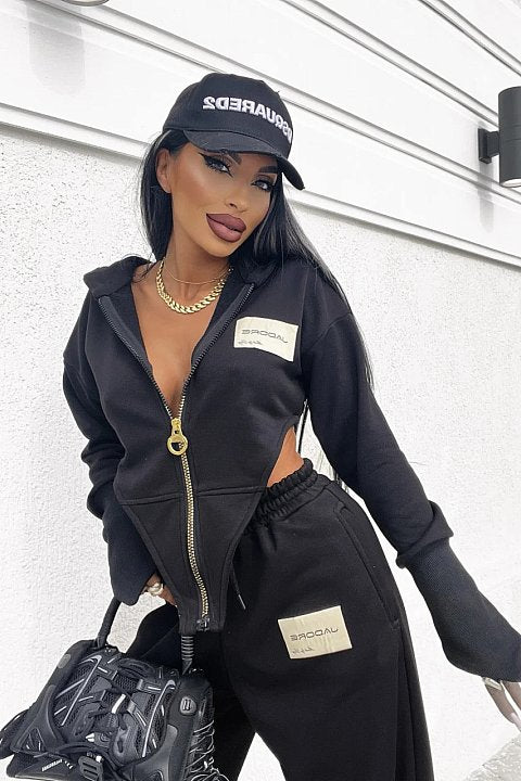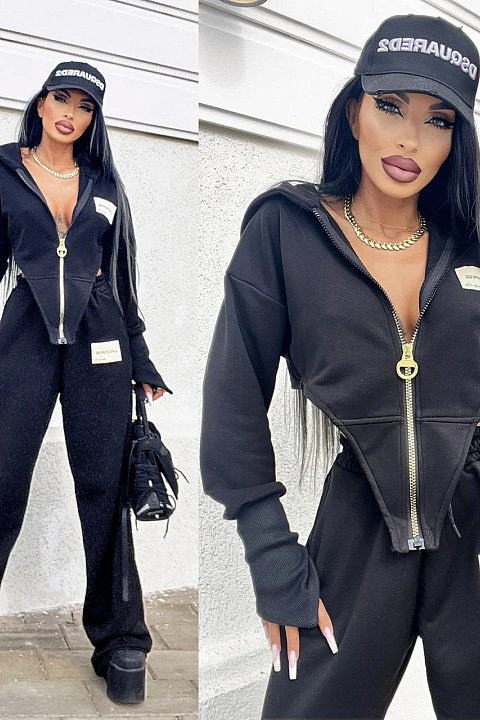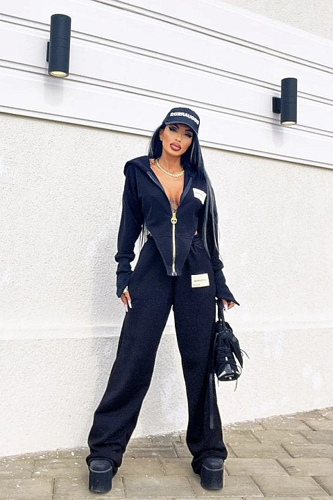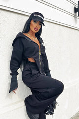 Completo sportivo 2 pezzi composto da felpa con cappuccio e zip, orlo e fondo manica a punta. Pantaloni comfy a vita alta e gamba larga con tasche nascoste.