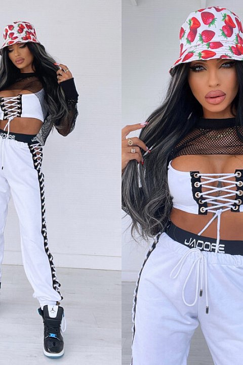 Set di 2 pezzi in bianco e nero, composto da bustier sexy con chiusura in pizzo e maniche a rete. E pantaloni a vita alta, accessoriati con lacci sui bordi.
