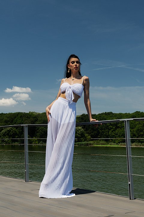Completo casual estivo plissettato 2 pezzi composto da top a fascia con fiocco e spalline di perle, e pantaloni a vita alta e gamba larga semi trasparenti.