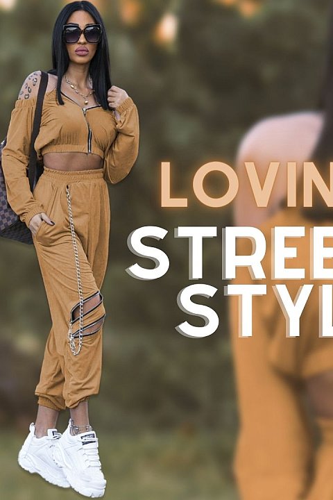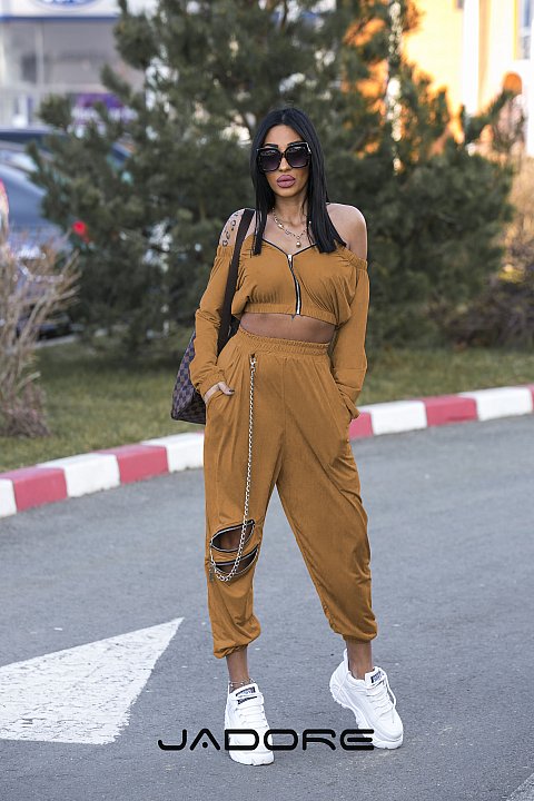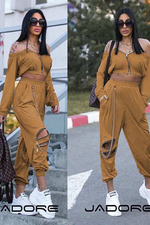 Completo sportivo " due pezzi " di colore beige. Taglio morbido per il pantalone a vita alta e il corpino a maniche lunghe e scollo a fascia. Zip metalliche destinate all'apertura-chiusura della stessa maglia e dei cut-out posti diagonalmente sulla gamba.