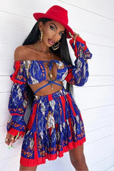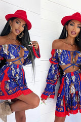Completo casual 2 pezzi in satin crepato composto da top bikini a maniche lunghe a spalle cadenti e gonna a vita alta.