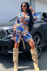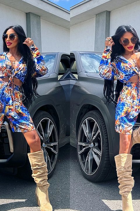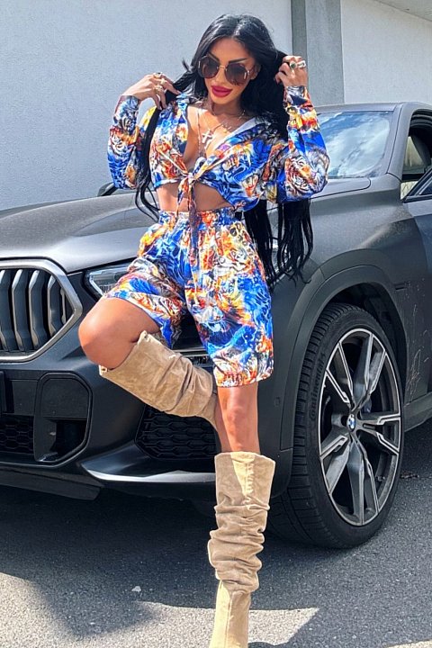 Completo donna con stampa tigrata Blu e Arancione Esprimi il tuo lato audace con questo sorprendente completo donna a due pezzi, caratterizzato da una vivace stampa tigrata nei toni del blu e arancione. Il top a maniche lunghe si annoda sul davanti, accentuando la vita e creando un look sensuale e dinamico. Gli shorts a vita alta, con la loro vestibilità comoda e le tasche laterali, completano perfettamente l'outfit, rendendolo ideale per occasioni casual ma con un tocco di stile in più. Caratteristiche principali: Colore: Blu e arancione con stampa tigrata Design: Completo a due pezzi con top annodato e shorts a vita alta Dettagli: Tasche laterali sugli shorts, maniche lunghe sul top Occasione: Perfetto per look casual con un tocco audace Taglie disponibili: XS, S, M, L