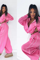 Stile e comfort si incontrano in questo completo sportivo rosa, composto da una felpa corta con zip e pantaloni ampi a vita alta. Con dettagli a contrasto bianchi, è perfetto per look casual e streetwear di tendenza. Ideale per il tempo libero e outfit moderni.