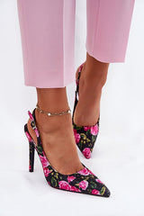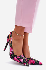 Queste décolleté nere con stampa floreale rosa sono perfette per dare un tocco romantico e deciso al tuo outfit. Il design a punta con cinturino slingback e tacco a spillo slancia la silhouette, mentre i piccoli strass aggiungono brillantezza al pattern a rose. Ideali per cerimonie, eventi eleganti o serate speciali, si abbinano magnificamente ad abiti monocolore, tailleur e gonne midi.